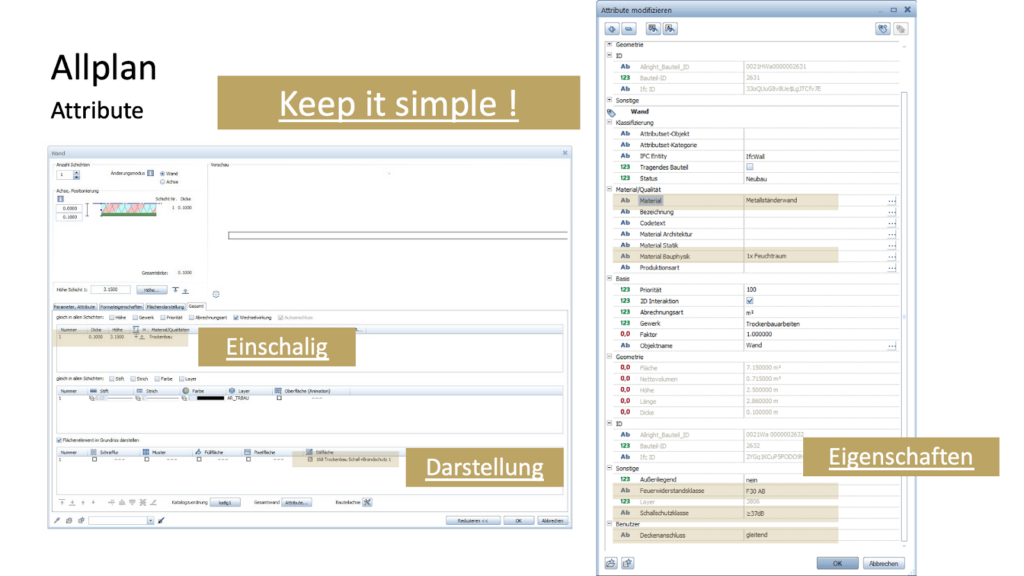 - Einschalige Modellierung: Elemente wie Wände (z.B. Trockenbau-, Mauerwerks- oder Betonwände) werden im Allplan-Modell lediglich als einschalige Bauteile angelegt. Es wird bewusst darauf verzichtet, jede einzelne Schicht (Beplankung, Dämmung, Ständerwerk) geometrisch abzubilden.