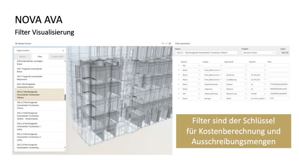 Das aus Allplan exportierte IFC-Modell enthält eine große Menge an Informationen. Um diese Daten für die Prozesse nach DIN und VOB nutzbar zu machen, ist die Erstellung von Filtern in NOVA AVA der wichtigste Parameter. Die Filter dienen dazu, die Bauteile schrittweise und präzise den gewünschten Kosten- oder LV-Positionen zuzuordnen.