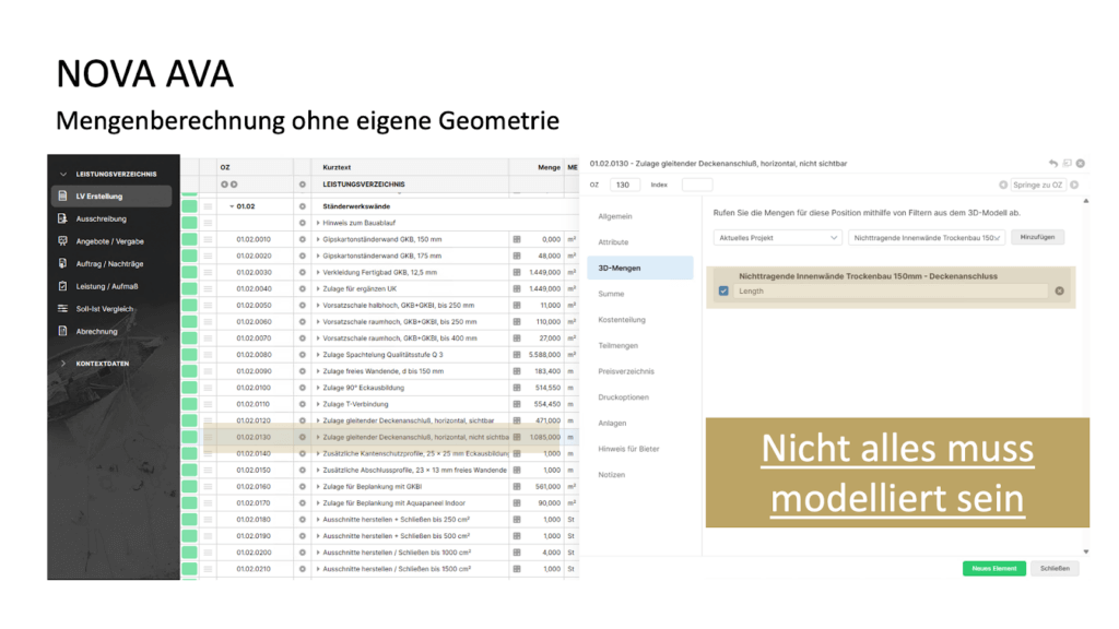Im Gegensatz zu einigen anderen BIM-Workflows setzt von Canal bei der Ausschreibung auf den gesicherten Mengenexport. Das LV wird nicht automatisch generiert, da der Export aus dem Modell hierfür noch nicht als sicher genug erachtet wird.