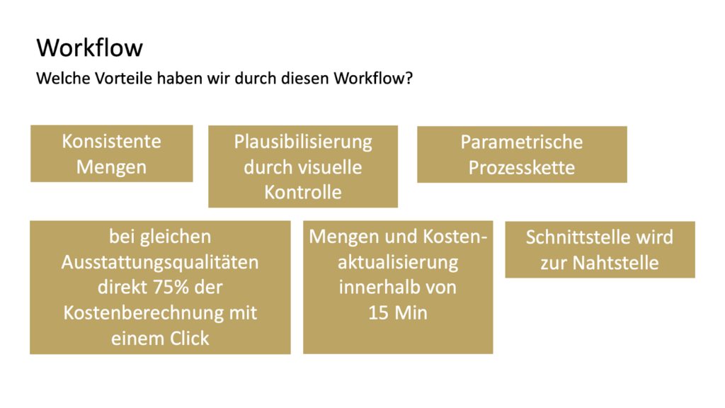 | Parametrische Prozesskette erzeugt Effizienz bei Wiederholungsprojekten | Bei Projekten mit gleichen Ausstattungsqualitäten können bis zu 75 % der Kostenberechnung mit nur einem Klick erledigt werden. |