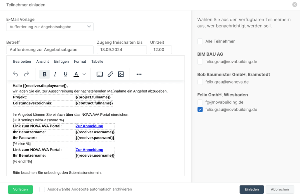 Modul Ausschreibung: Einladungen zu einer Ausschreibung können jetzt gezielt nur für die E-Mail CC-Adresse des Bieters erfolgen.