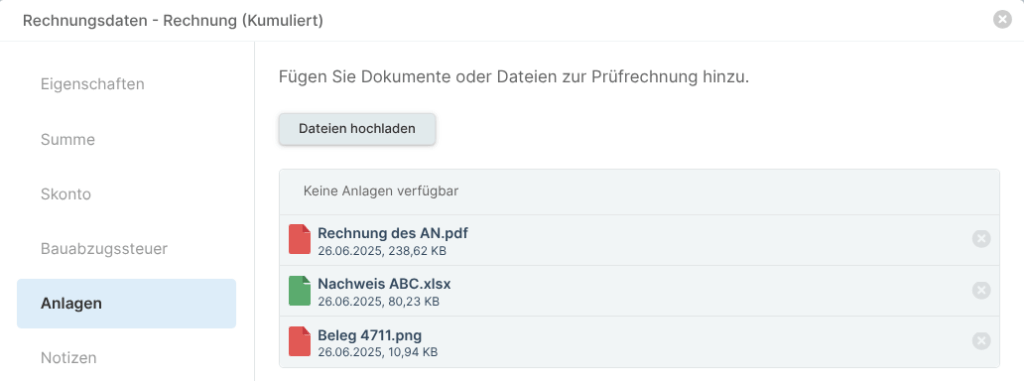 Modul Abrechnung: Zu einer Prüfrechnung können jetzt beliebige Dokumente und Dateien, z.B. auch die Original-Unternehmerrechnungoder andere Nachweise und Belege einfach abgelegt werden.
