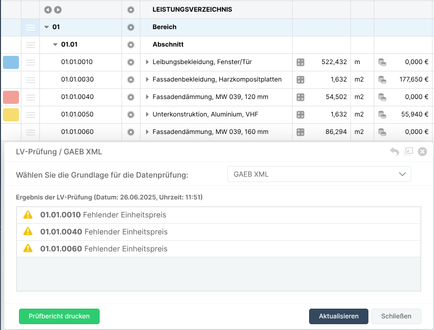 Modul Leistungsverzeichnis: Wir haben eine weitere LV-Prüfung implementiert. Hierüber wird eine Warnung geschaltet, wenn ein Positionspreis auf 0€ steht. Damit kann nun sichergestellt werden, dass der LV-Kostenvoranschlag preislich vollständig ist.