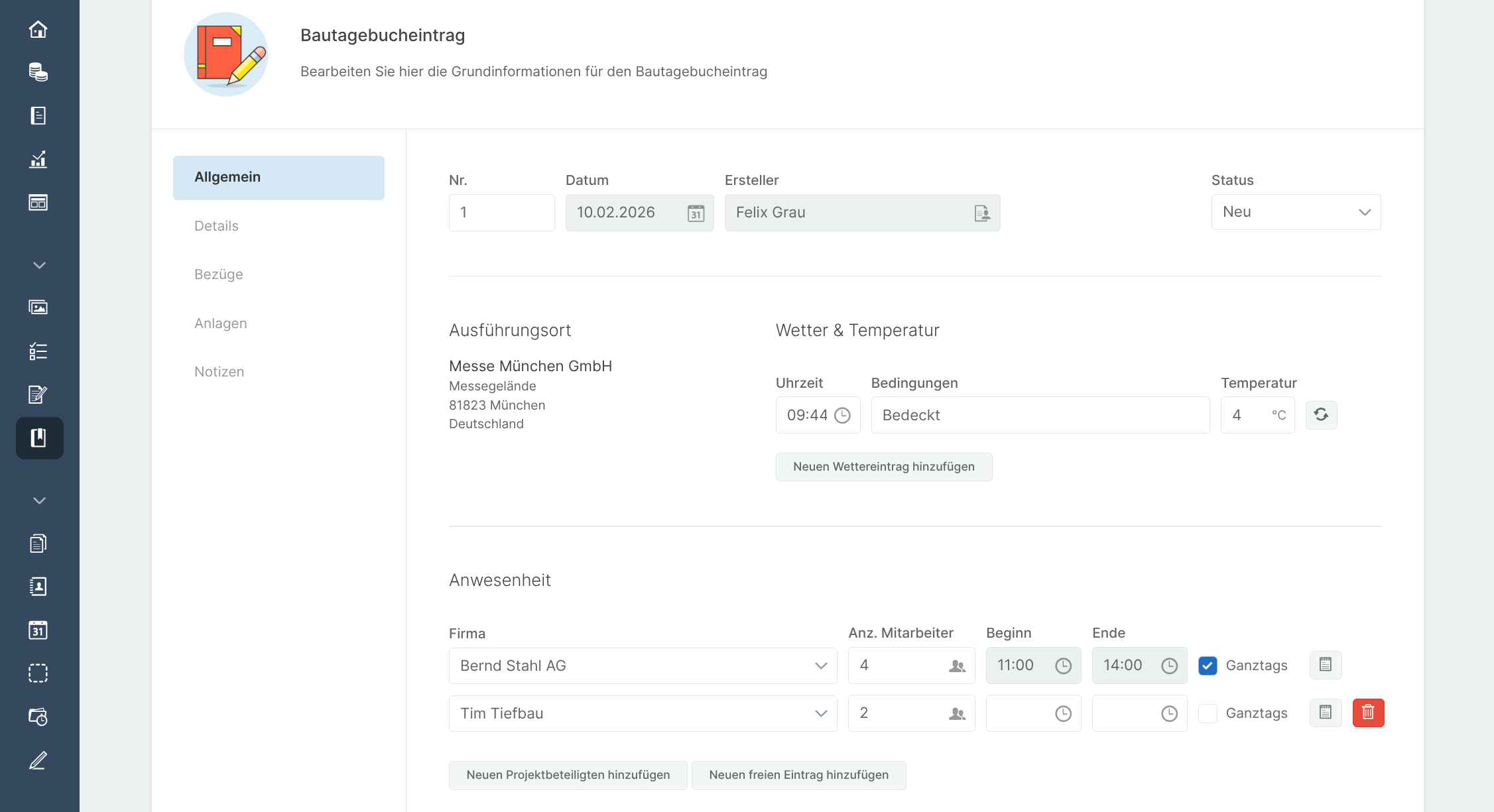 In a way, a construction diary is also a log. But a very special one with a very special must. That’s why NOVA AVA has its own tab. This is where you record all mandatory information directly.