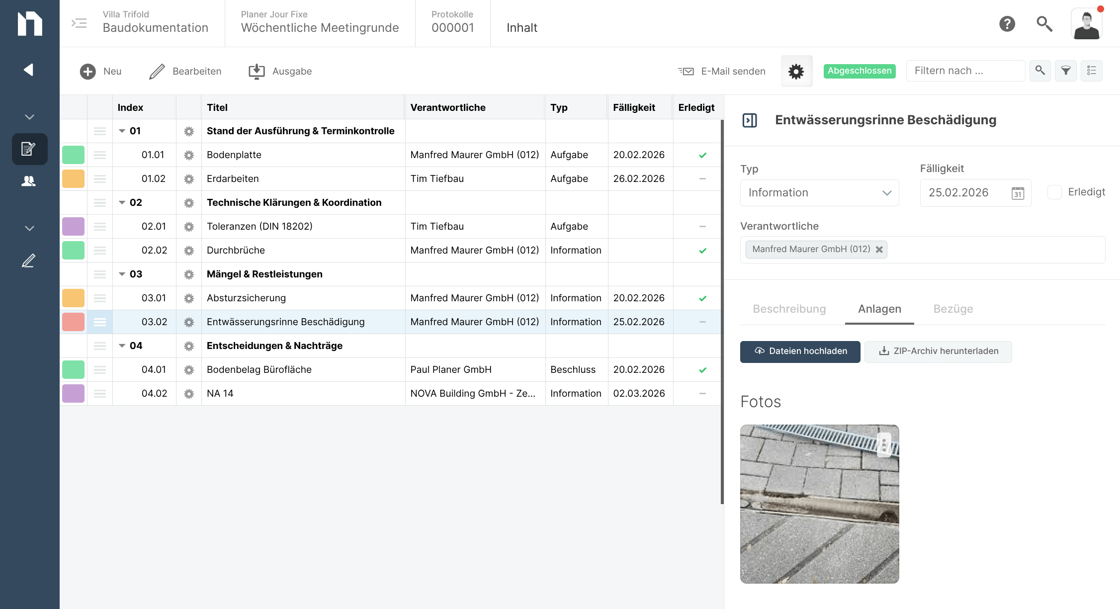 Tasks with responsibilities and deadlines are an essential part of every construction meeting. With the ticket system, you can easily keep an eye on these points. You can enter new topics in a meeting as a ticket right away and then link it to your meeting minutes.