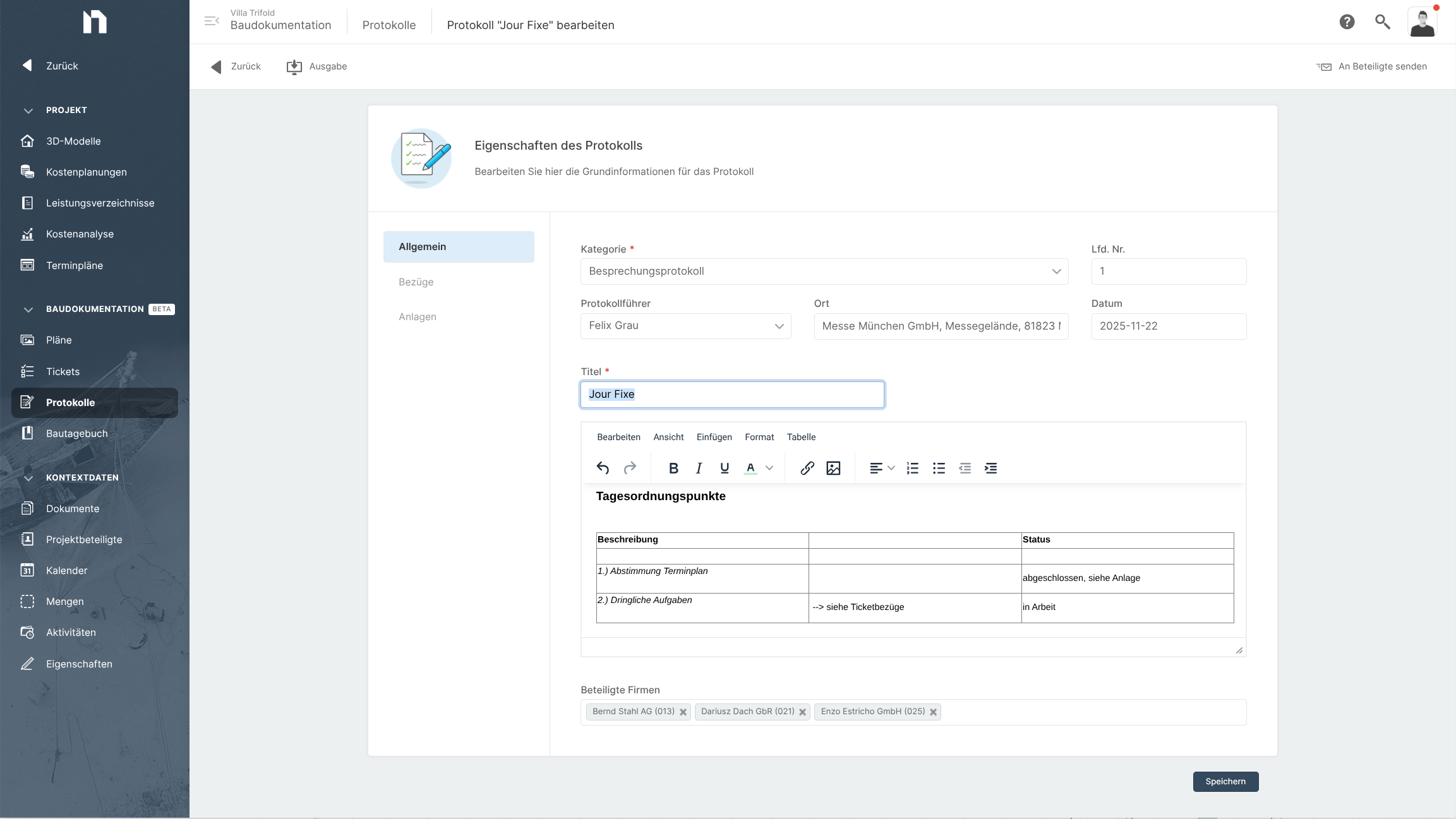 Kurz: Es gibt für eine Aufgabe nur ein Ticket, das an die richtigen Stellen verlinkt wird – in dein Protokoll, in dein Bautagebuch und – zusätzlich immer möglich – an die betroffene Leistungsposition im Auftrags-LV etc.