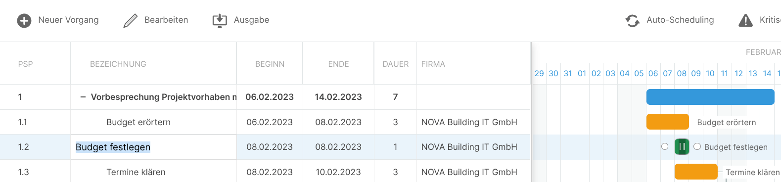Bisher konnten die Informationen zu einem Vorgang im Bauzeitenplan bzw. deiner Terminplanung, z.B. die Bezeichnung, das Startdatum, die Dauer, die Priorität und weitere, nur im Eigenschaften Dialog zum Vorgang erfasst und geändert werden. Wir haben nun die Möglichkeit geschaffen, diese Inhalte auch direkt in der Vorgangstabelle zu bearbeiten: