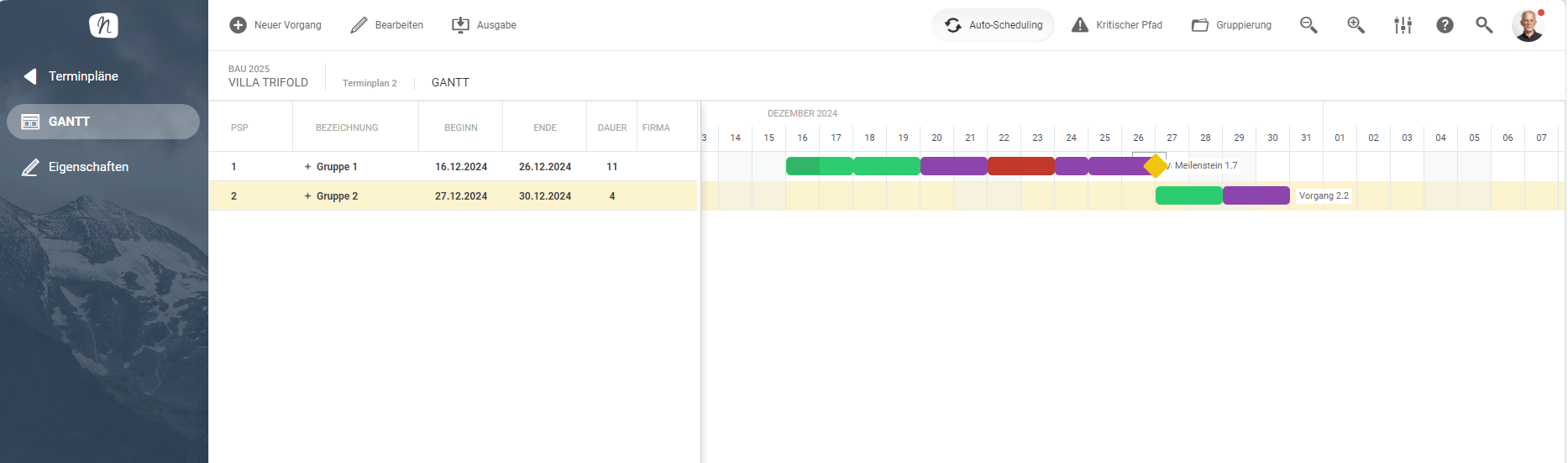 Das Beispiel rechts zeigt mehrere (Teil-)Vorgänge, die in zwei Vorgangsgruppen zusammengefasst werden. Die (Teil-)Vorgängen werden dabei von verschiedenen Firmen ausgeführt.
