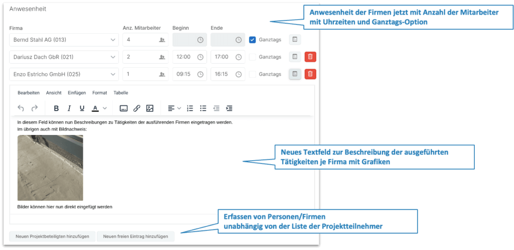 - Personalerfassung: Die Anwesenheit von Firmen wird detailliert mit Mitarbeiteranzahl, Uhrzeiten oder einer pauschalen „Ganztags-Option“ dokumentiert.