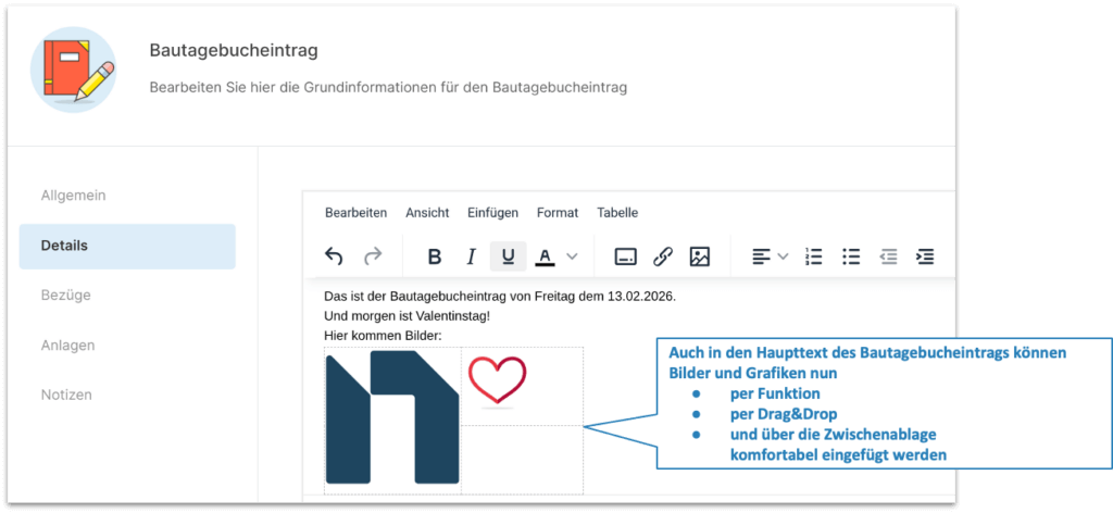 Mit dem Update Baudokumentation können nun auch Bilder und Grafiken in den Haupttext des Bautagebucheintrags eingefügt werden und zwar