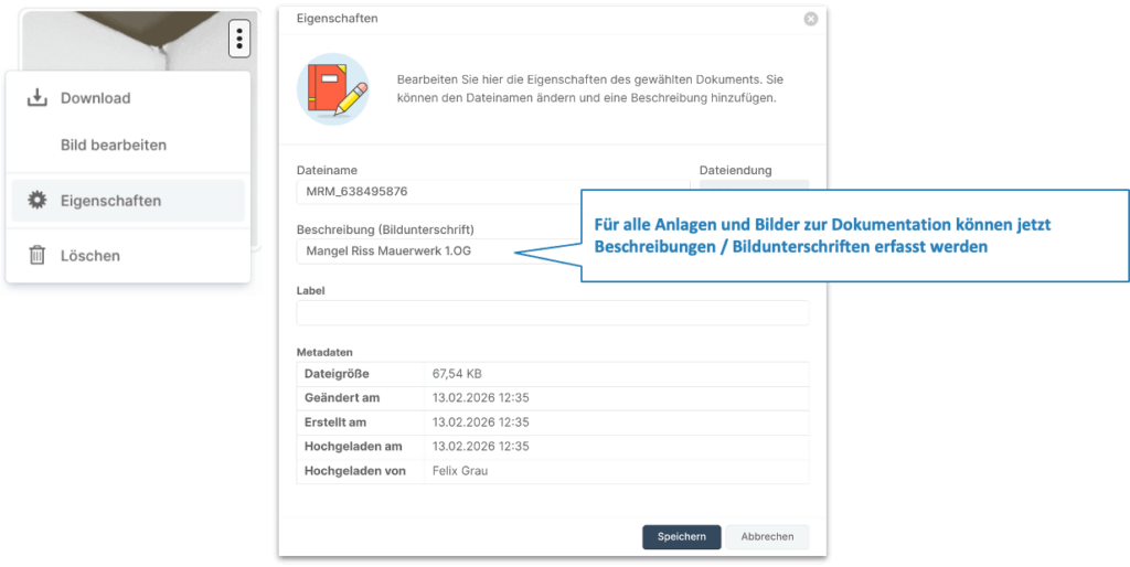 Für alle Anlagen und Bilder zur Dokumentation können jetzt Beschreibungen bzw. Bildunterschriften erfasst werden.