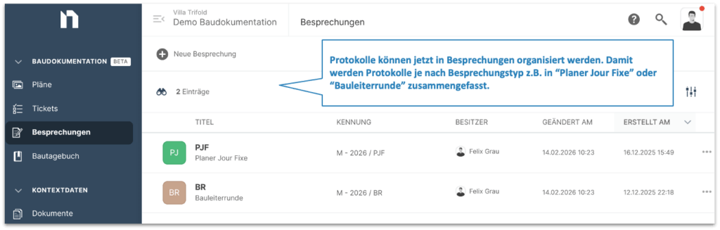 Protokolle können jetzt in Besprechungen organisiert werden. Damit werden Protokolle je nach Besprechungstyp zusammengefasst, z.B. in „Planer Jour Fixe“ oder „Bauleiterrunde“.