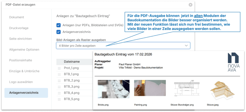 Für die PDF-Ausgabe können jetzt in allen Modulen der Baudokumentation die Bilder besser organisiert werden. Mit der neuen Funktion lässt sich nun frei bestimmen, wie viele Bilder in einer Zeile ausgegeben werden sollen.