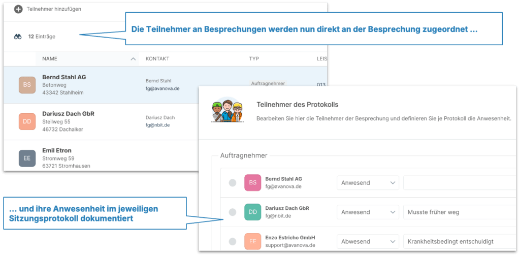 Die Teilnehmer an Besprechungen werden nun direkt an der Besprechung zugeordnet und ihre Anwesenheit im jeweiligen Sitzungsprotokoll dokumentiert.