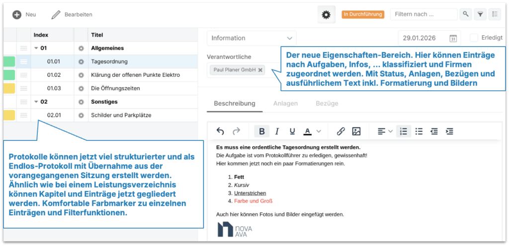 Mit dem Update Baudokumentation wurde die Protokollführung zu einem umfassenden Management-Tool für Jour Fixe Meetings ausgebaut: