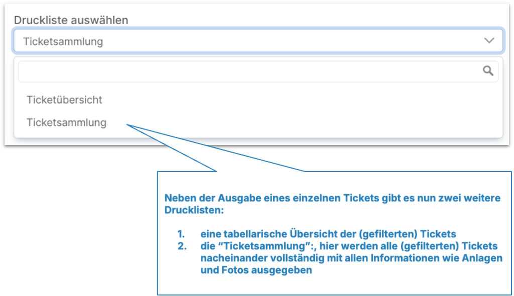 Neben der Ausgabe eines einzelnen Tickets gibt es nun zwei weitere Drucklisten: