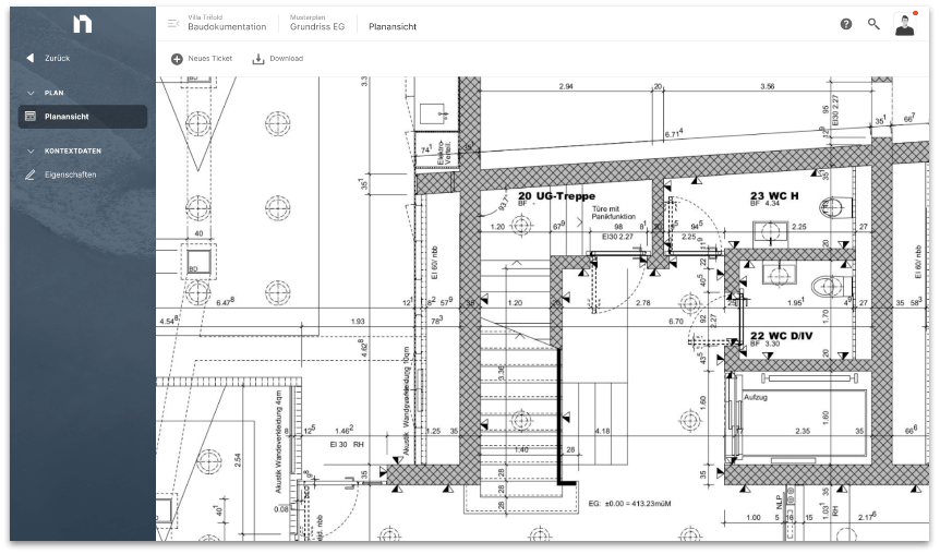- 2D-Verortung: Die Pläne dienen als präzise Grundlage, um Tickets zur Mängelverfolgung räumlich exakt zu positionieren.